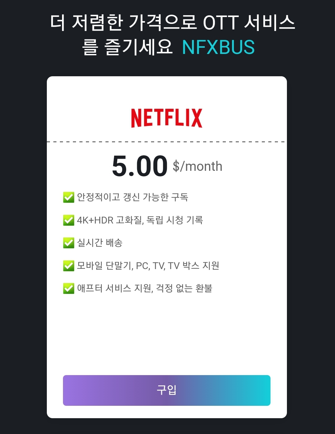 "혼자 구독하기에는 비싸서 망설였는데, NFXBus 덕분에 가족들과 함께 저렴하게 이용 중입니다. 서비스도 간편하고 만족스러워요!"